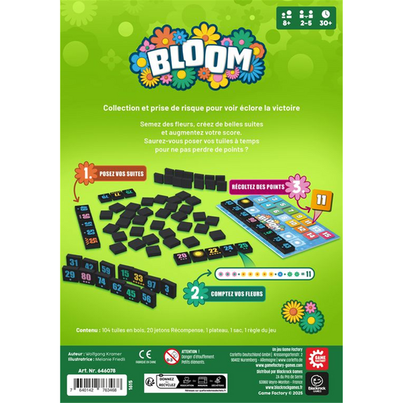 Dans Bloom, chaque choix compte : poser ses tuiles pour marquer rapidement des points ou en piocher d'autres pour viser une suite plus lucrative ? Assemblez des suites numériques astucieuses, volez des tuiles à vos adversaires, optimisez vos poses pour récupérer les jetons les plus convoités. Plus vos suites comptent de fleurs, plus vous marquez. Mais attention à ne pas trop garder en main : chaque fleur non posée vous coûtera cher ! Grâce à une prise en main rapide, une tension constante et des interactions malicieuses, Bloom offre une expérience aussi accessible que stratégique, entre planification, opportunisme et prises de risques calculées.