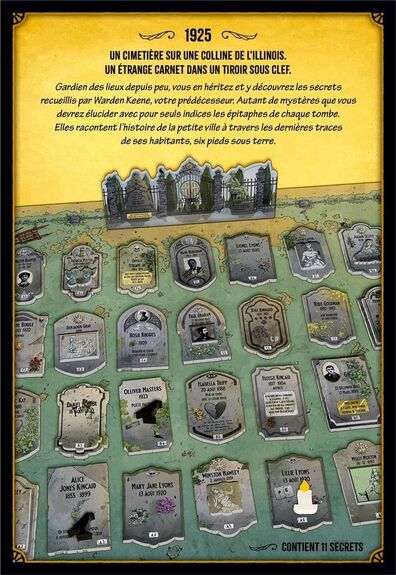 A vous de mener l’enquête de tombe en tombe en décryptant les épitaphes avec logique. Vous exhumerez au grand jour les 11 mystères qui hantent ces lieux, à l’aide d’un seul outil : votre sens de l’observation. Faites dialoguer les tombes en révélant les histoires de leurs occupants. Pas de points, pas de scores, seul le plaisir de l'enquête. Lorsque vous êtes bloqués, une aide vous guide pas à pas, sans gâcher la surprise. Le matériel de jeu, somptueux, vous plonge dans l'atmosphère unique d'un cimetière du siècle dernier. Inspiré du recueil de poèmes Spoon River Anthology, ce jeu narratif coopératif est aussi fascinant qu'ingénieux.