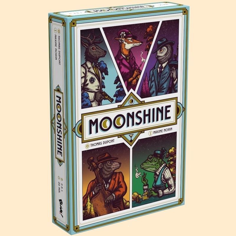 Moonshine est un jeu de construction de moteur avec des dés dans lequel les joueurs jouent en simultané. A chaque tour de jeu, chacun exploite le résultat des dés obtenu par le joueur actif, afin de renforcer l'attrait de son bar clandestin.